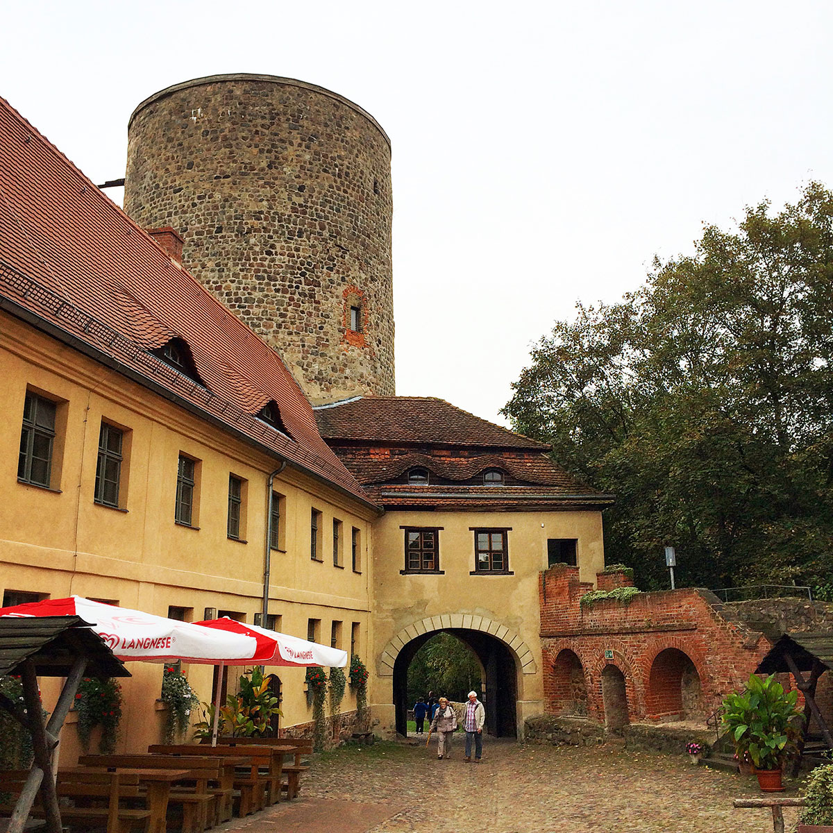 Auf dem Steilen Hagen, 152 Meter hoch und inmitten eines dichten Waldes gelegen thront die Burg Rabenstein. Einst zur Sicherung mittelalterlicher Wege bestimmt lädt sie nunmehr zu Speis und Trank. Das Gasthaus ist liebevoll gepflegt und – wie viele Wirtschaften im Hohen Fläming – modern rustikal. Der Blick vom Burgfried lohnt, auch wenn das Treppensteigen anstrengt. Selbst Daniel mit seiner Höhenangst traut sich hinauf und ist schier überwältigt vom Blick ins Umland. Auch die Hündin erklimmt die Stufen, bis diese zu steil werden und sie nicht mehr weiterkommt. Der Nebel, mittlerweile zu Wolken verzogen, hängt zwar tief, taucht dafür aber die Landschaft in stimmungsvolles Licht. Zuweilen wird mir melancholisch bei so viel Geschichte aus heutiger Sicht.