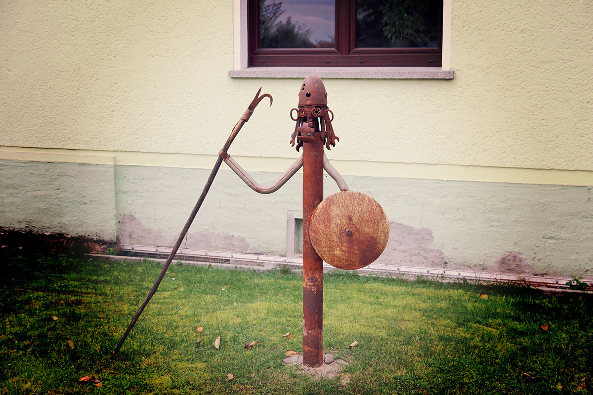 Nicht in Richtung Westen, nach Jeserighütten, sollen wir wandern, sondern weiter nach Norden, nach Jeserig direkt zeigt der Wegweiser. Ob es den Einwohnern der Ortschaften eigentlich recht ist, dass mitten durch ihren Alltag Wanderer, ja Fremde strömen? Auch wenn Gasthöfe und Wirtschaften davon profitieren, wurden sie eigentlich gefragt? Aber so wenige Menschen, wie wir bisher auf dem Weg gesehen haben, scheint es ja auch niemanden wirklich zu stören. Oder ist die Vernachlässigung dieses Strauchs eher ein Ausdruck des Unwillens und ein Versuch von Widerstand? Wir wissen es nicht und wandern weiter.