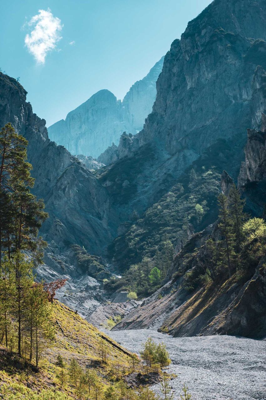Plötzlich werde ich aus diesem Flow herausgerissen, als sich auf der gegenüberliegenden Felswand kleinere Brocken lösen und laut polternd ins Tal fallen. Etwas oberhalb erkenne ich den Grund dafür. In ausgesetzter Höhe springt ein Gamsbock auf einem eigentlich viel zu schmalen Felstritt von Vorsprung zu Vorsprung und vollführt dabei fast schon akrobatische Verrenkungen. Dabei schielt er immer wieder zu mir, dem Eindringling, herüber. Ich beobachte seine tollkühnen Künste, bis er viel zu klein ist und weit genug weg. Erst dann schultere ich meinen Rucksack und wandere weiter.