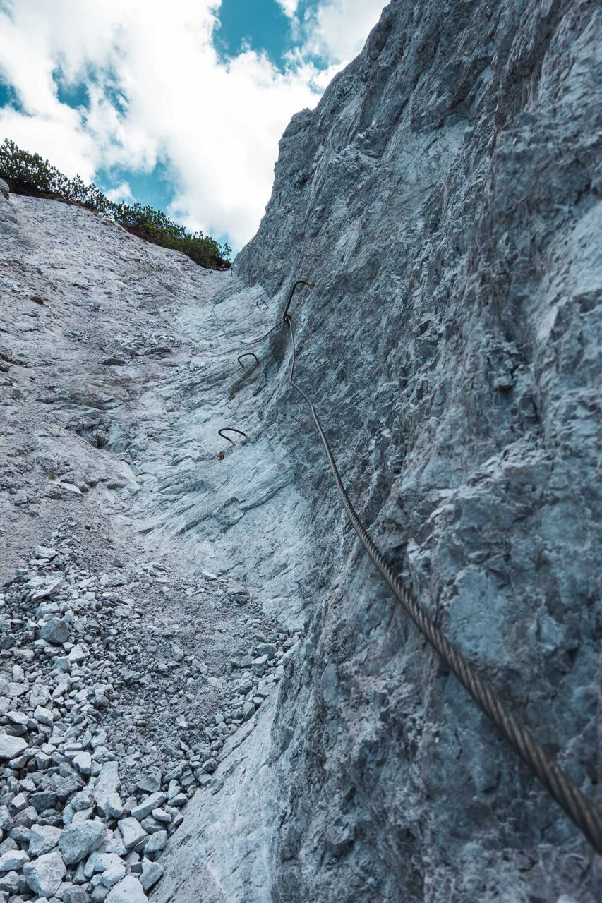 Ab diesem Moment wird auch klar, warum dieser Abschnitt als schwarzer Bergweg ausgewiesen ist. Der schmale Pfad führt über lockeres und rutschiges Geröll. Immer wieder muss ich dabei größere Brocken überklettern oder umkraxeln, was ziemlich anstrengend ist. Am Ende warten eine knapp zehn Meter lange Eisenkette und ein paar in die steile Felswand geschlagene Tritte auf mich. Sie führen mich steil, fast senkrecht hinauf zur Scharte. Ich überlege kurz, ob ich mir das zutraue, und komme zu dem Schluss, dass ich schon schwierigere Passagen überwunden habe.