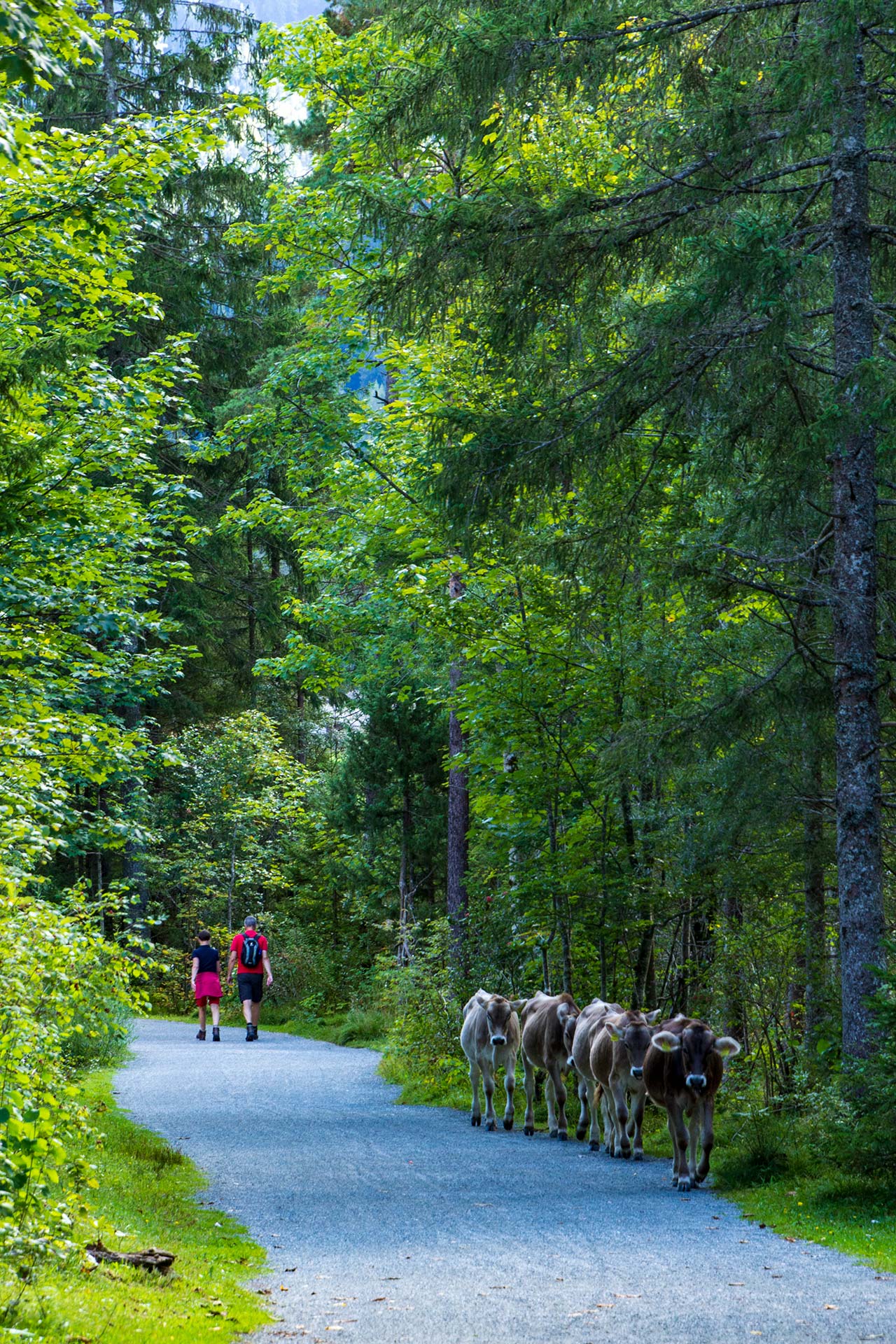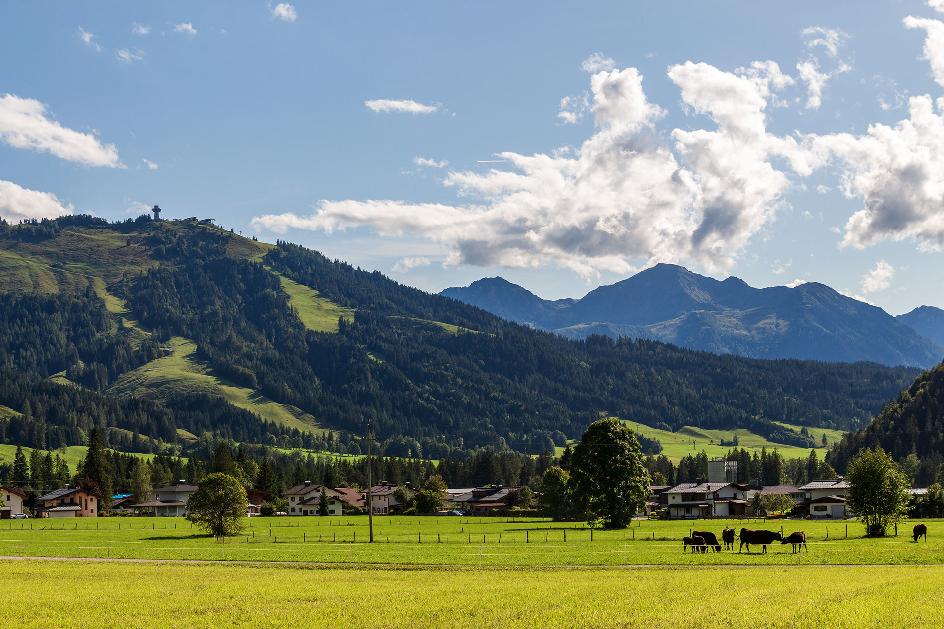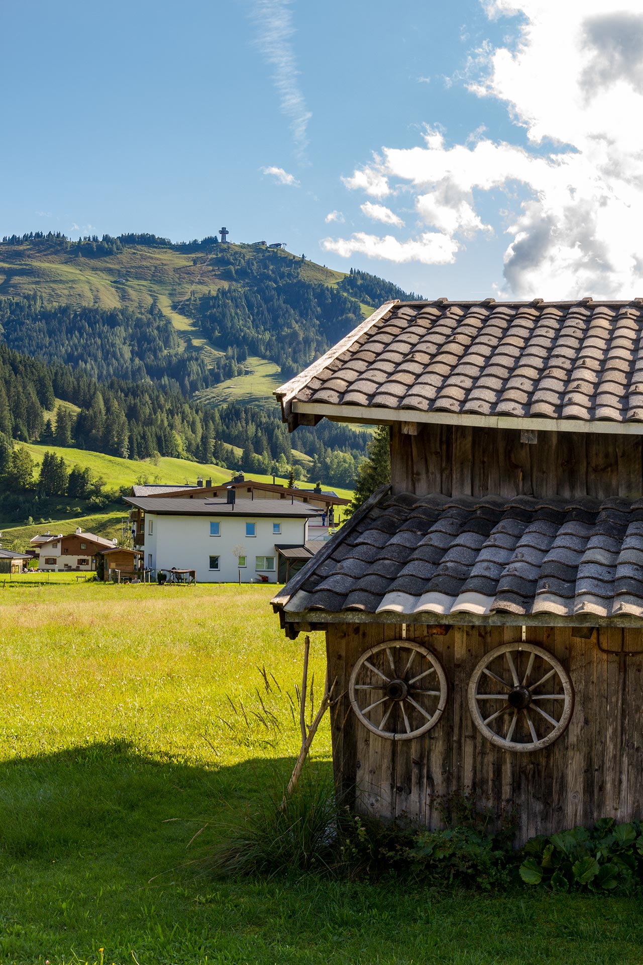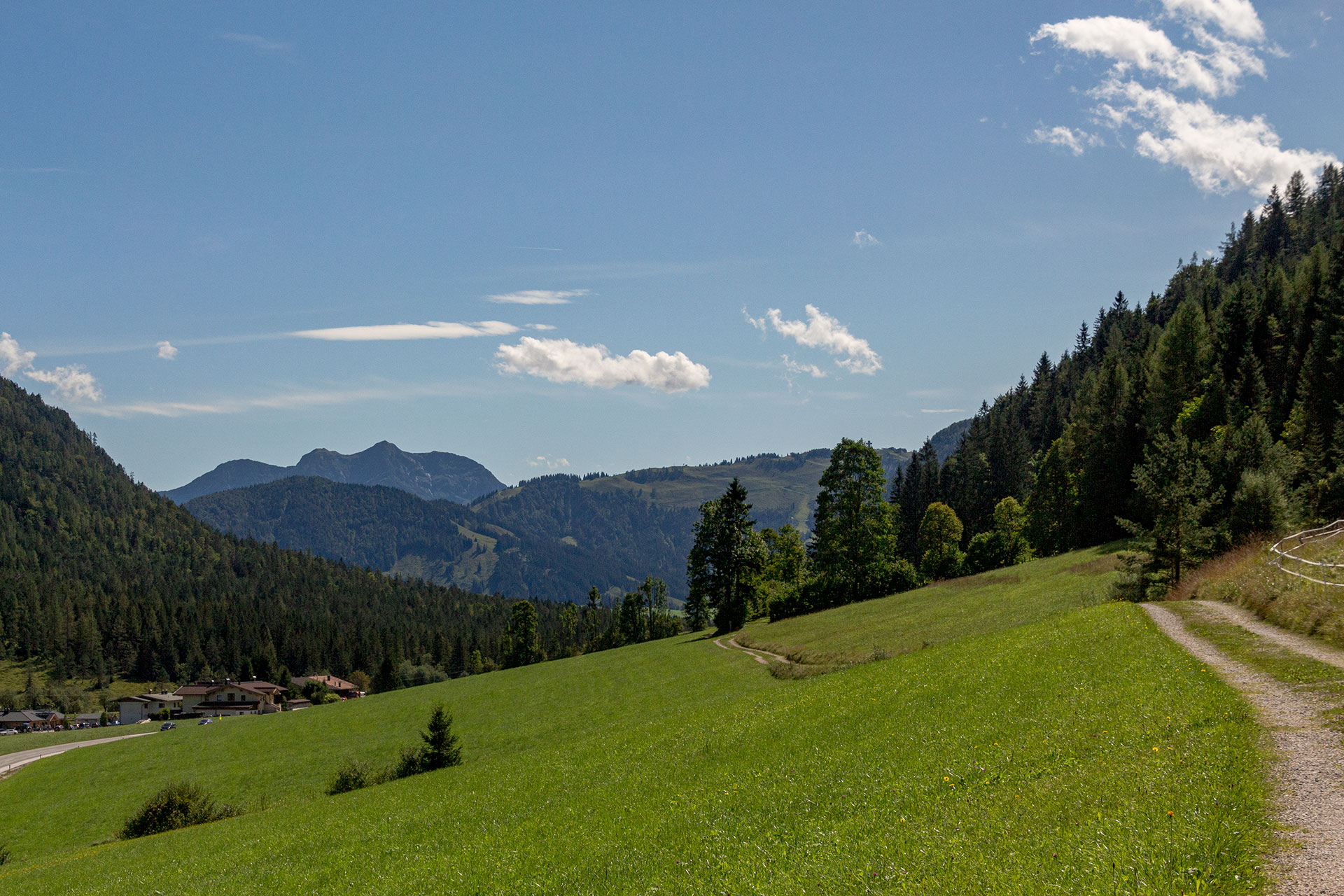 Waidring macht sich gar nicht erst die Mühe, dem eigenen Hausberg einen gesonderten Namen zu geben. Er heißt schlicht Hausberg und ist der erste Gipfel, den es auf dem WaiWi zu erklimmen gilt. Nach guten zwei Kilometern und 500 Höhenmetern wird man mit einer fantastischen Aussicht belohnt. Noch ein wenig begleiten mich die Geräusche aus dem Tal und mischen sich mit dem Rauschen des Windes in den Bäumen und dem Singsang der Vögel, die sich gegenseitig vor mir, dem Eindringling, warnen. Während ich zur Talsenalm aufsteige, verschwindet die Zivilisation und es wird merklich ruhiger. Für einen kurzen Moment bin ich das erste Mal allein.