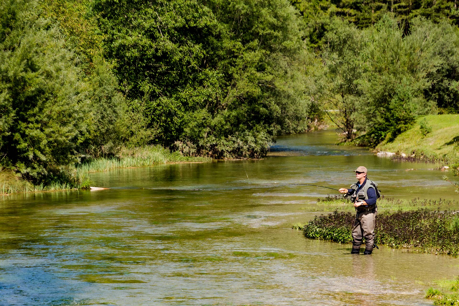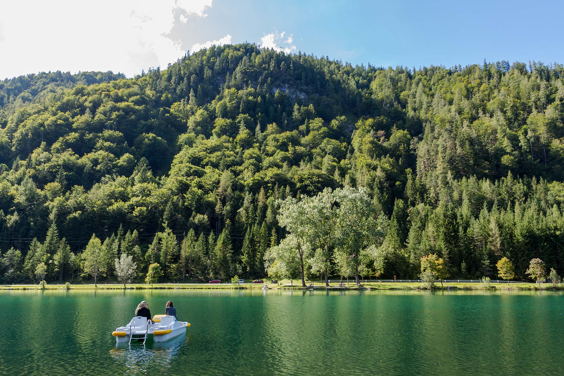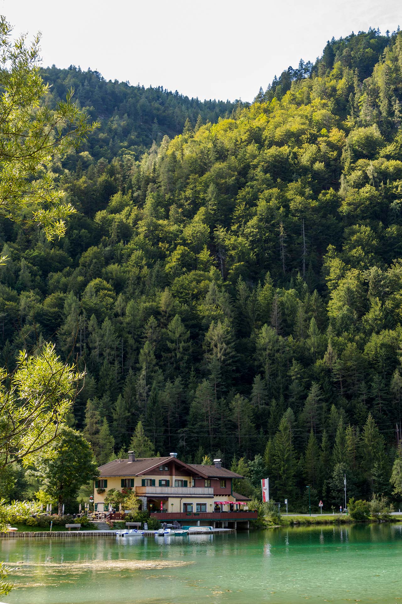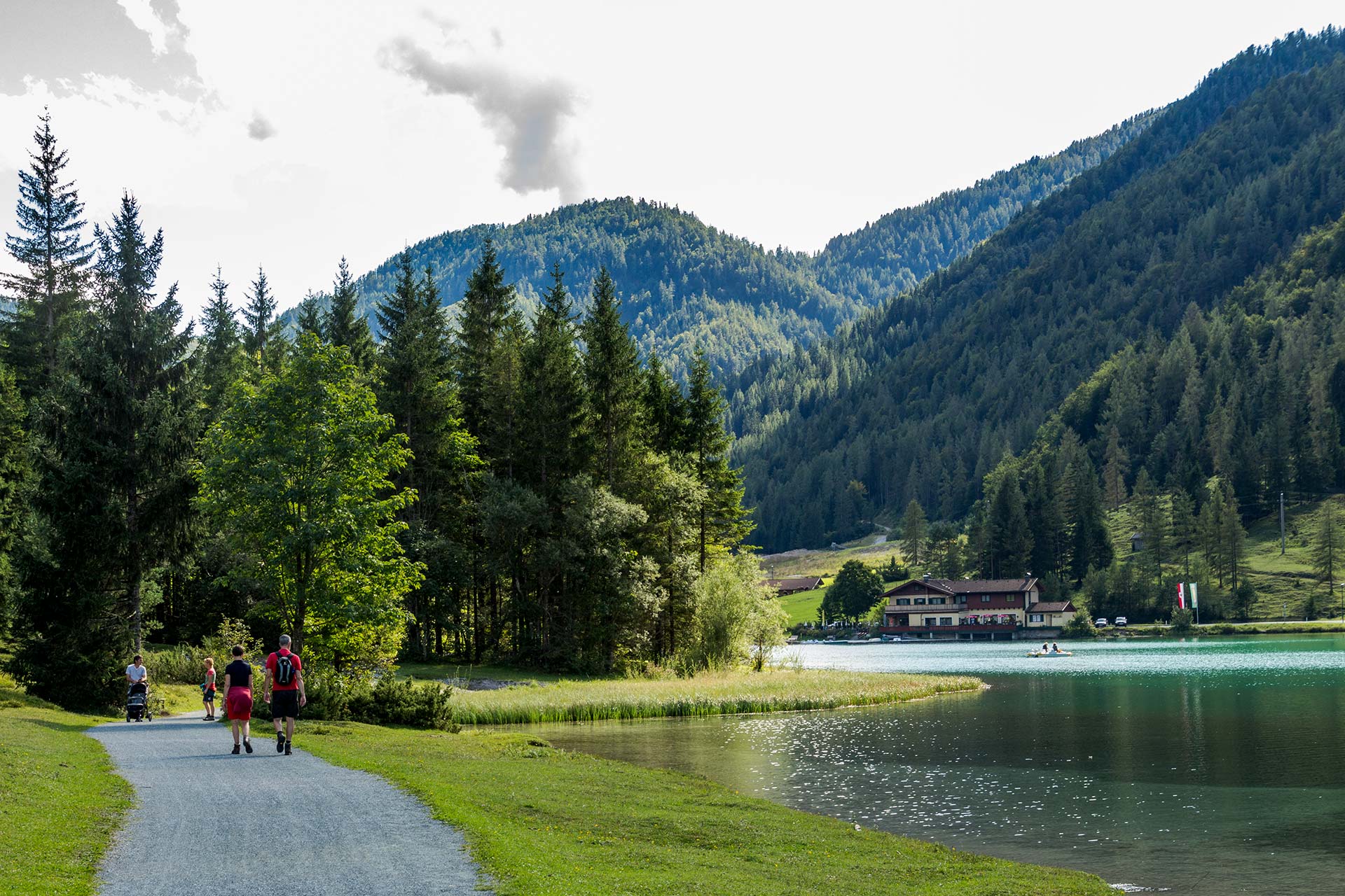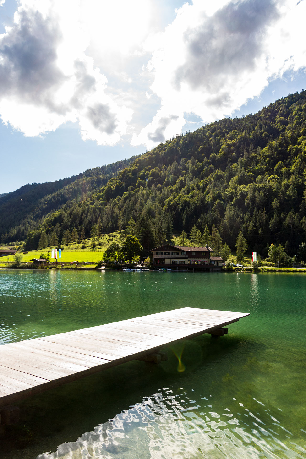 Schon von weitem schimmert der smaragdgrüne Pillersee durch die Bäume. Nach den knapp acht Kilometern treffe ich nun zum ersten Mal wieder auf eine größere Menschenansammlung. An seinem Ufer stehen Angler, die nach Forellen jagen. Ein Stand-up-Paddler treibt verloren über die spiegelglatte Oberfläche, während sich Wanderer und Touristen an seinem Ufer sonnen. Auch wenn das Wasser mit 15 Grad doch recht kühl ist, kann ich nicht anders. Ich muss einfach hinein. Man kann den Pillersee nicht besuchen, ohne zumindest die Füße ins Wasser zu stecken.