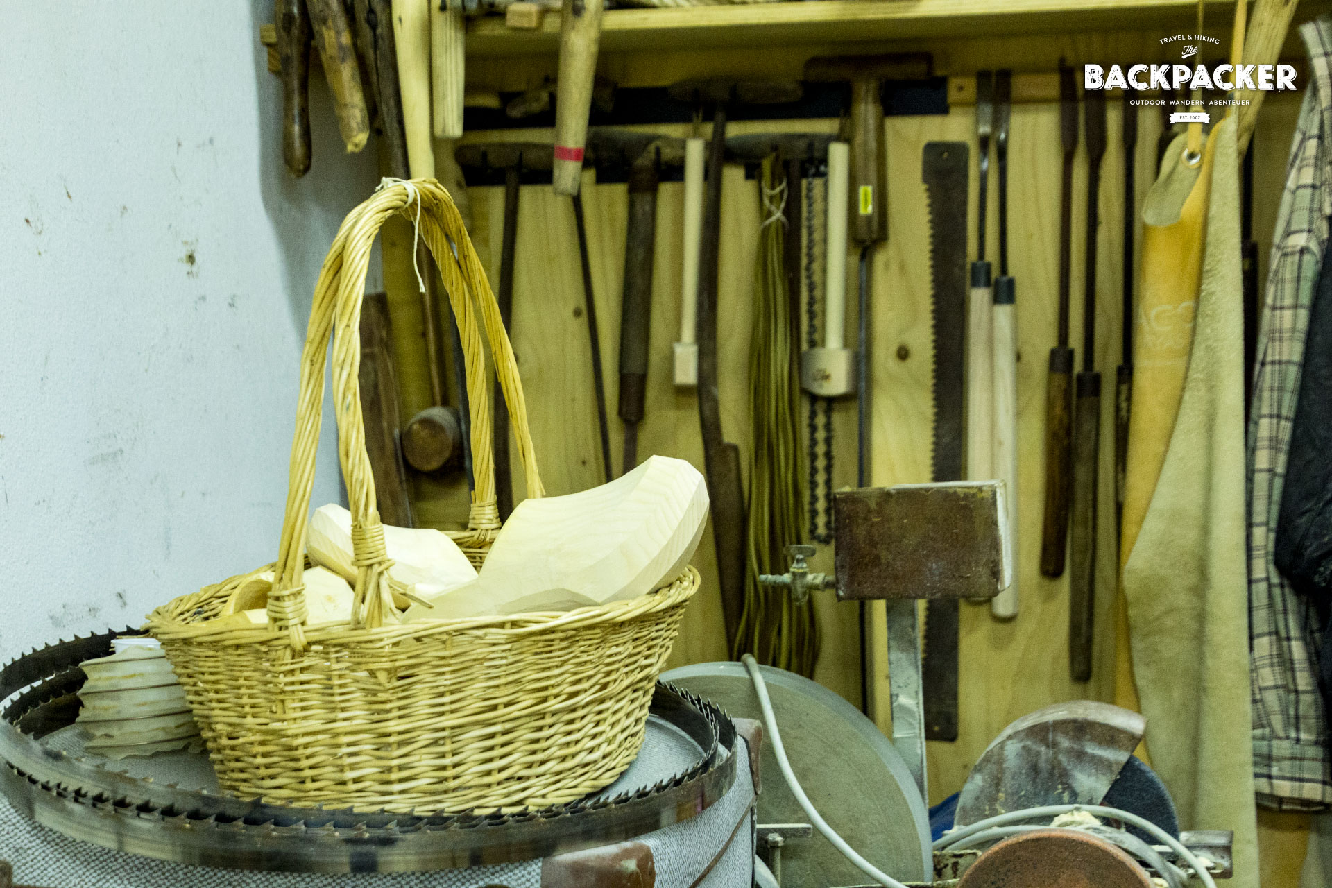 Als ich den Laden betrete, der eigentlich nur aus einem Regal, einem Vorhang und einem Verkaufsthresen besteht, werde ich von Michel Becquet freundlich begrüßt. Ihm gehört der Laden und er ist einer von den wenigen übrig gebliebenen Herstellern der Sabots im Aostatal. „Ganze fünf sind es nur noch“, gibt er mir zu verstehen. Das Handwerk muss beherrscht werden, was nicht jeder tut und braucht Zeit, um aus einem Stück Holz diese Art der Schuhe herzustellen. „Aber wenn sie mal fertig sind, passgenau auf den Fuss zugeschnitten, möchte man sie nicht mehr missen“ versucht er mir mit einem Zwinkern die Besonderheiten der Schuhe zu erklären. Er lädt mich ein, seine Werkstatt zu besuchen. Die liegt vor neugierigen Augen geschützt hinter dem Vorhang und wirft mich augenblicklich in eine andere Zeit zurück.