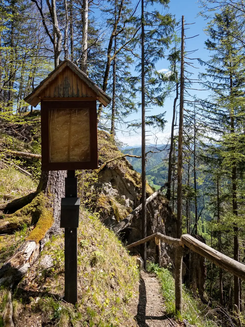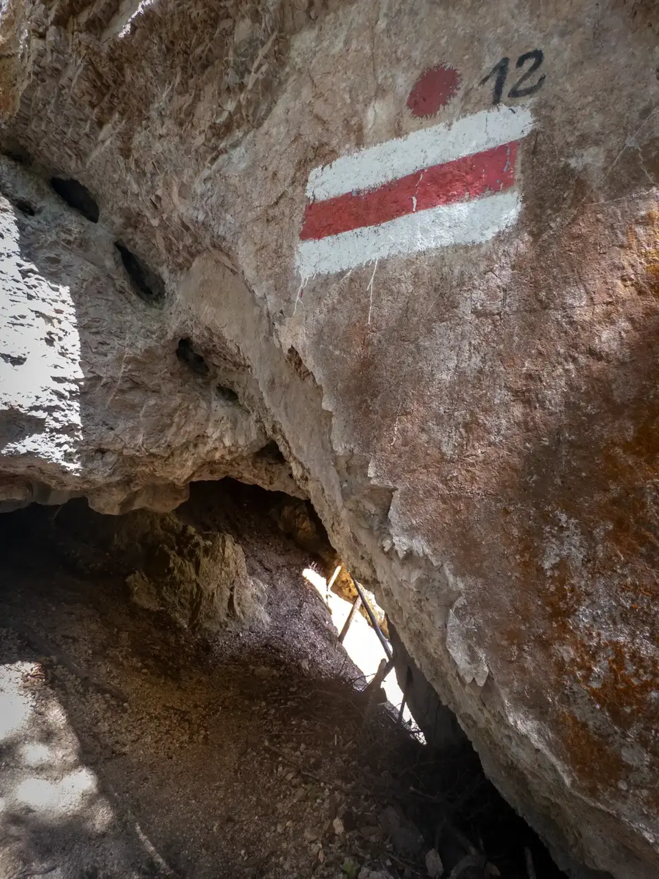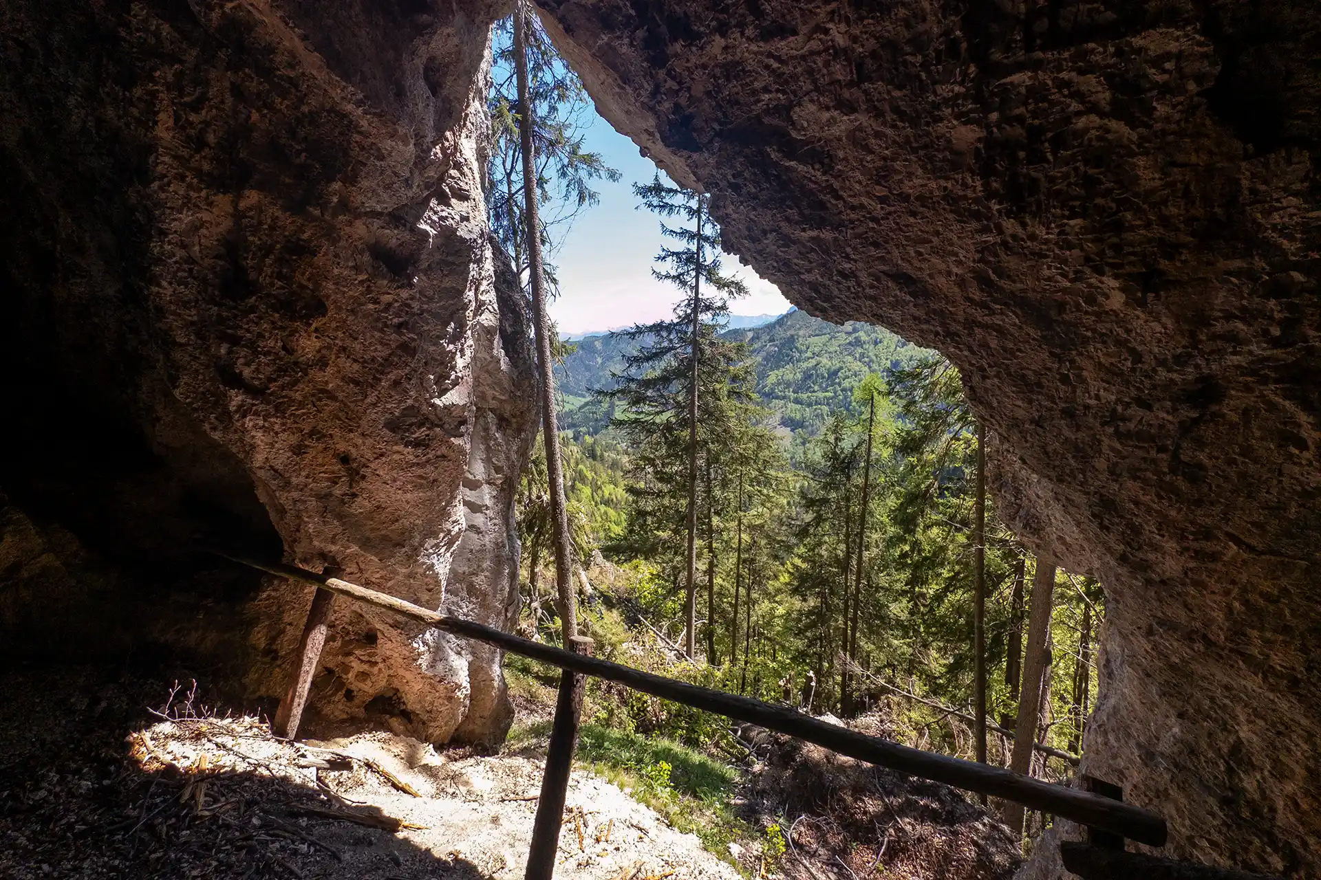 Man muss keine Sagen glauben, um diesen Namen zu verstehen. Die Atmosphäre dort zwingt förmlich zum Innehalten. Ich setze mich auf die Rastbank, lasse den Ort auf mich wirken, esse mein Brot und blicke gedankenverloren in die dunkle Öffnung des Felsens. Dann steige ich ab in Richtung Spitzenbachklamm.