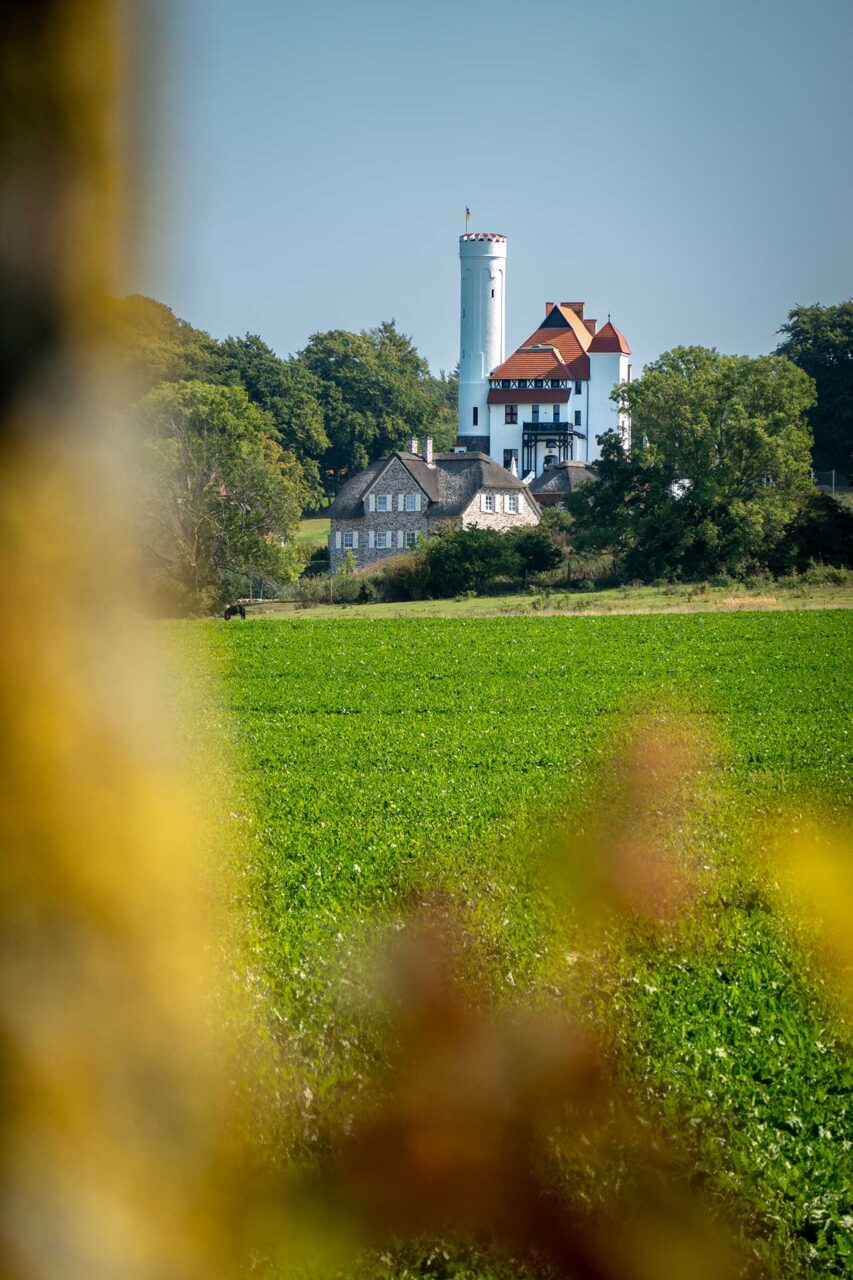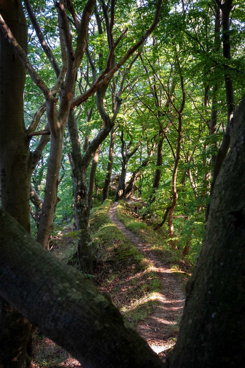Zurück zur Straße und weiter gehts. Links am Horizont glühen die weißen Kreidefelsen von Kap Arkona im Sonnenlicht, darunter glänzt die Ostsee in türkisem Blau. Rechts lugt der Turm von Schloss Ranzow zwischen den Baumkronen hervor. Hinter dem Ortsrand von Lohme folge ich einem kleinen Schild nach rechts zum Schloss Ranzow. Das Schloss, heute elegantes Hotel mit weitläufigem Golfplatz, verbindet Geschichte und Gegenwart. Ich umrunde die Fairways, spüre den weichen Waldboden, und tauche in den dichten Buchenwald ein. Ein frischer Hauch salziger Ostseeluft fährt durch die Kronen und lässt die Blätter flüstern.
