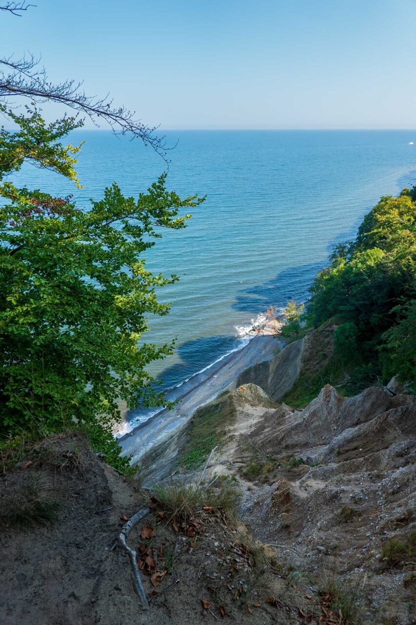 Der Pfad zieht sich oberhalb der Steilküste entlang. Die erste Aussicht ist ein Moment zum Innehalten: Weit schweift der Blick über tosende Wellen und schroffe Felsen. Als zeige sich die Ostsee hier in all ihrer Pracht. Ein Platz zum Innehalten.