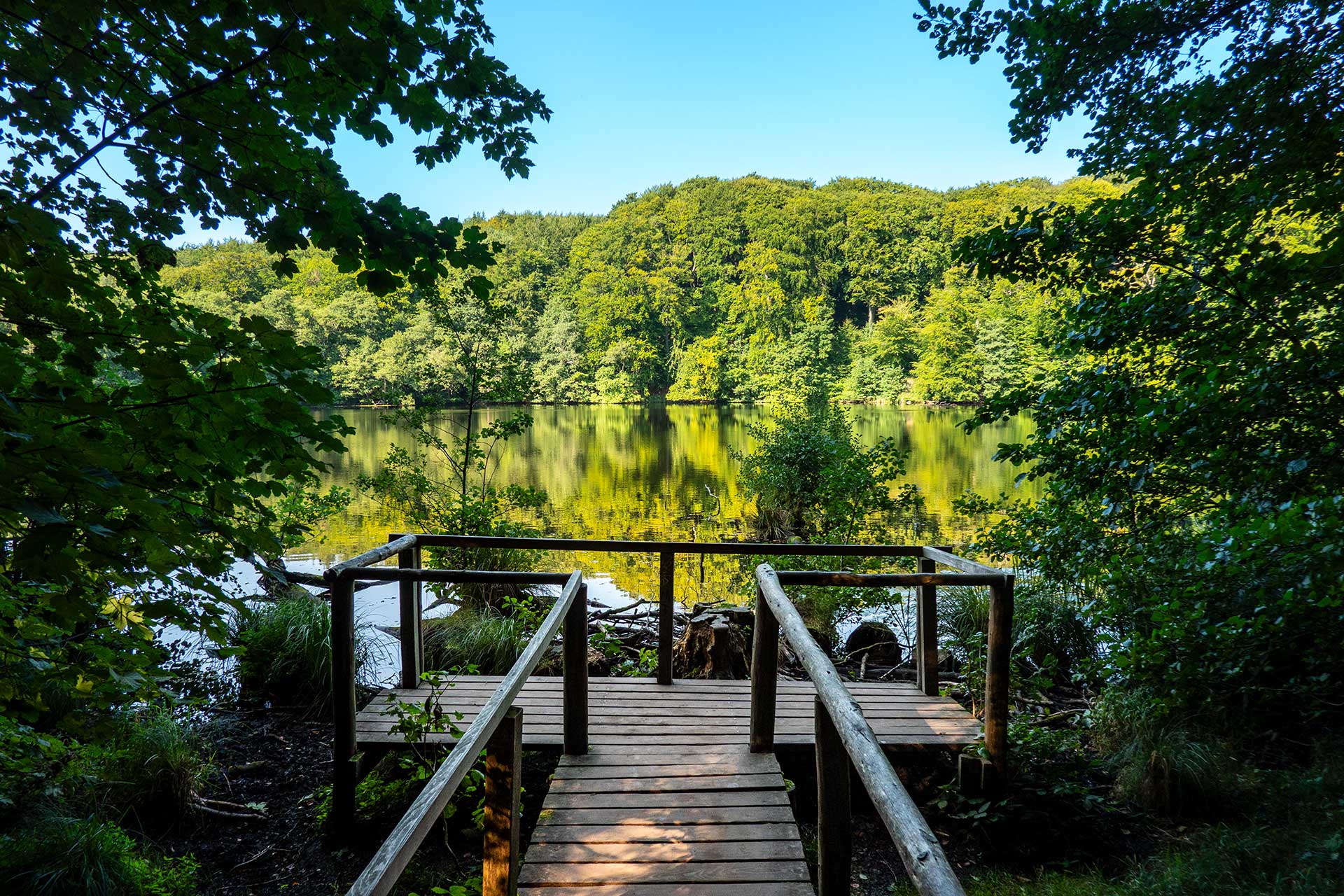 Auf dem Hauptweg gleitet mein Blick über die Höhen eines alten Ringwalls. Dahinter liegt versteckt hinter dichtem Gebüsch der Herthasee. Man erzählt, die germanische Göttin Hertha habe hier nach einer Rundfahrt ihren Streitwagen reinigen lassen. Das Wasser birgt ein dunkles Geheimnis: Sklaven, die halfen, wurden geopfert, damit ihr Geheimnis nicht verraten wurde. Ein Holzsteg öffnet den Blick auf den stillen See. Durch dichtes Gebüsch scheint der Wind der Vergangenheit über den zu flüstern und kann man seinem Geheimnis durch die Bäume lauschen.